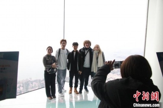 美國高校學(xué)生在青島海天中心城市觀光廳合影留念。王宇軒 攝