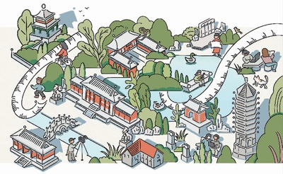 周 玨繪周玨畢業(yè)于北京大學考古文博學院,是一名職業(yè)插畫師,曾經參加過導師張劍葳副教授組織的燕園文物數字化工作坊。她用畫作描述了師生參與燕南園歷史地段景觀保護與展示項目的情景?!把鄨@曾是我學習生活過的地方,又是值得研究與保護的文化遺產。燕園不僅以塔、湖聞名,還有西校門、辦公樓、紅五樓、校景亭、花神廟和燕南園。”