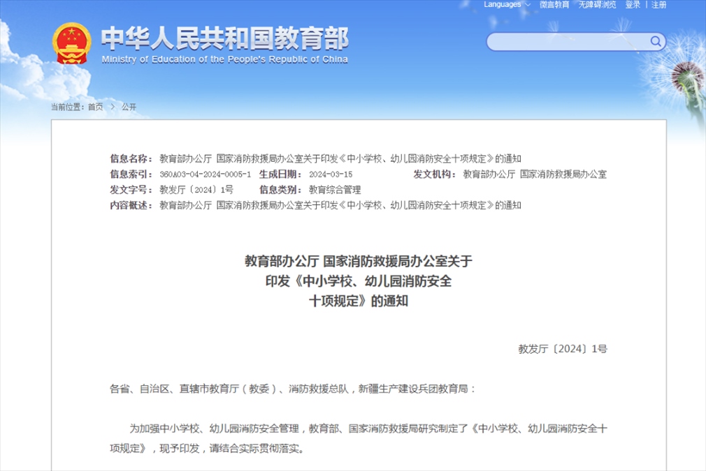記者近日從教育部獲悉,為加強中小學校、幼兒園消防安全管理,教育部、國家消防救援局研究制定了《中小學校、幼兒園消防安全十項規(guī)定》。規(guī)定明確,中小學校、幼兒園應定期開展教職工、安保人員消防安全培訓。