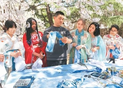 近日,江蘇海洋大學(xué)舉辦了一場別開生面的“藍染”體驗課。課堂上,留學(xué)生們在專業(yè)老師的指導(dǎo)下,親手體驗藍染技藝的神奇與美妙,感受中國傳統(tǒng)文化的獨特魅力。圖為老師給留學(xué)生們講解藍染技法。