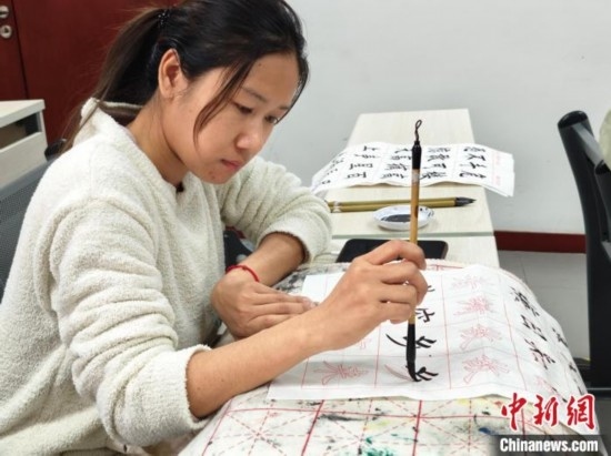 4月3日,在北京華文學院參加中文學習班的泰國學員吳嘉莉正在練習書法。(中新網(wǎng)記者韓輝 攝)