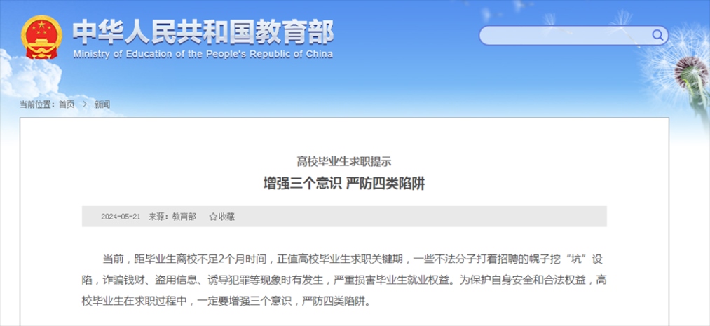 當(dāng)前正值高校畢業(yè)生求職關(guān)鍵期,一些不法分子打著招聘的幌子挖“坑”設(shè)陷,詐騙錢財(cái)、盜用信息、誘導(dǎo)犯罪等現(xiàn)象時(shí)有發(fā)生,嚴(yán)重?fù)p害畢業(yè)生就業(yè)權(quán)益。教育部5月21日提示高校畢業(yè)生,嚴(yán)防非法職業(yè)中介陷阱、嚴(yán)防招聘收費(fèi)陷阱、嚴(yán)防招聘詐騙陷阱、嚴(yán)防“貓膩”合同陷阱。