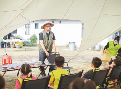 潘偉在“蔬東坡”農(nóng)場給參加研學活動的孩子們做農(nóng)業(yè)知識科普。