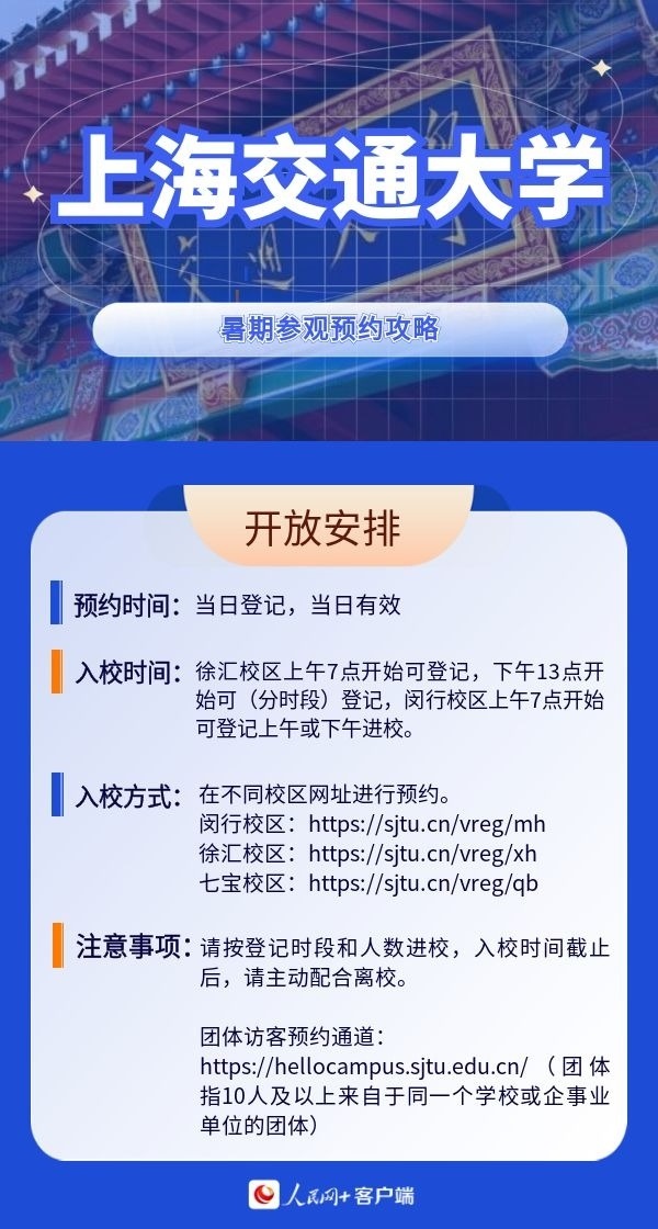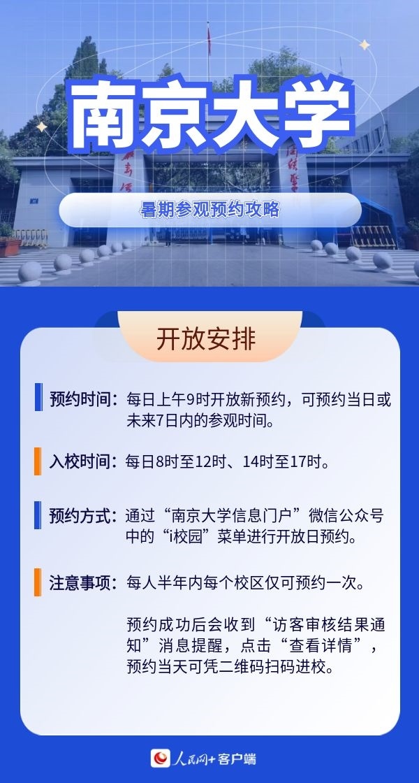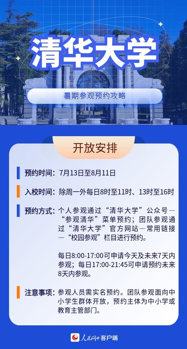 人民網(wǎng)北京7月19日電 暑假來臨,帶孩子參觀高校,感受學(xué)校人文歷史底蘊(yùn)以及濃厚的學(xué)術(shù)氛圍,已經(jīng)成為很多家長的選擇。近日,全國多所高校開放校園,接受公眾參觀。那么如何預(yù)約進(jìn)校?有什么注意事項(xiàng)?人民網(wǎng)特別整理了部分高校的參觀預(yù)約攻略,一起來看。(郝孟佳、實(shí)習(xí)生趙雪祺)