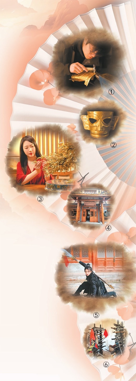 | 圖①:王莘閣在工作。圖②:王莘閣復刻的三星堆黃金面具。圖③:雁鴻展示她制作的工藝品。圖④:雁鴻國風研習技藝館。圖⑤:張含亮在進行武術(shù)視頻拍攝。圖⑥:張含亮拍攝用的兵器道具。本文照片由受訪者提供潘旭濤制圖 |