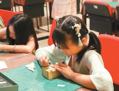 在四層的非遺手工藝體驗(yàn)中心,許多小朋友正在興致勃勃地體驗(yàn)古法制玉、敦煌石粉彩繪技藝(壁畫(huà)臨?。?、紙箋加工技藝(流沙箋團(tuán)扇制作)等非遺項(xiàng)目。一位小朋友正在美美地?cái)[弄著自己親手制作的流沙箋團(tuán)扇。她的母親許女士介紹說(shuō),這些項(xiàng)目雖然看著傳統(tǒng)但其實(shí)非常時(shí)尚,孩子很喜歡這些手工項(xiàng)目,覺(jué)得很有趣;帶孩子在博物館里看展覽還能做手工,是一項(xiàng)很有意義的體驗(yàn)。