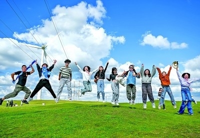 8月22日,參加第三十屆海峽兩岸大學(xué)生新聞營的師生們?cè)趦?nèi)蒙古烏蘭察布市輝騰錫勒草原合影。新華社發(fā)