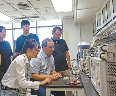 北京郵電大學(xué)多頻微波通信技術(shù)團(tuán)隊的劉元安教授(右二)指導(dǎo)學(xué)生開展科研工作。唐玉嬋攝(人民視覺)