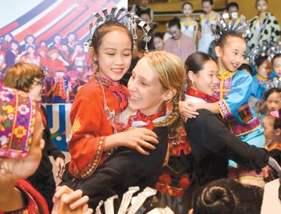 演出結(jié)束后,中法兩國(guó)青少年相互擁抱。中新社記者 駱云飛攝