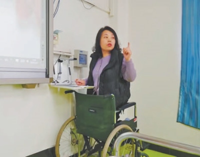 因為無法行走,王秀穎上課只能依靠輪椅。為了不影響教學(xué),她把輪椅滑到幻燈機(jī)前,跪在輪椅上,找到合適的高度,一邊講解,一邊演算、書寫。