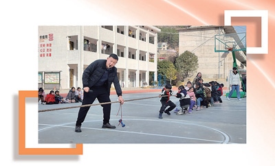 湖南省安化縣南金鄉(xiāng)將軍完小的操場上,龐曉曉(前排左一)組織學生們開展拔河比賽。