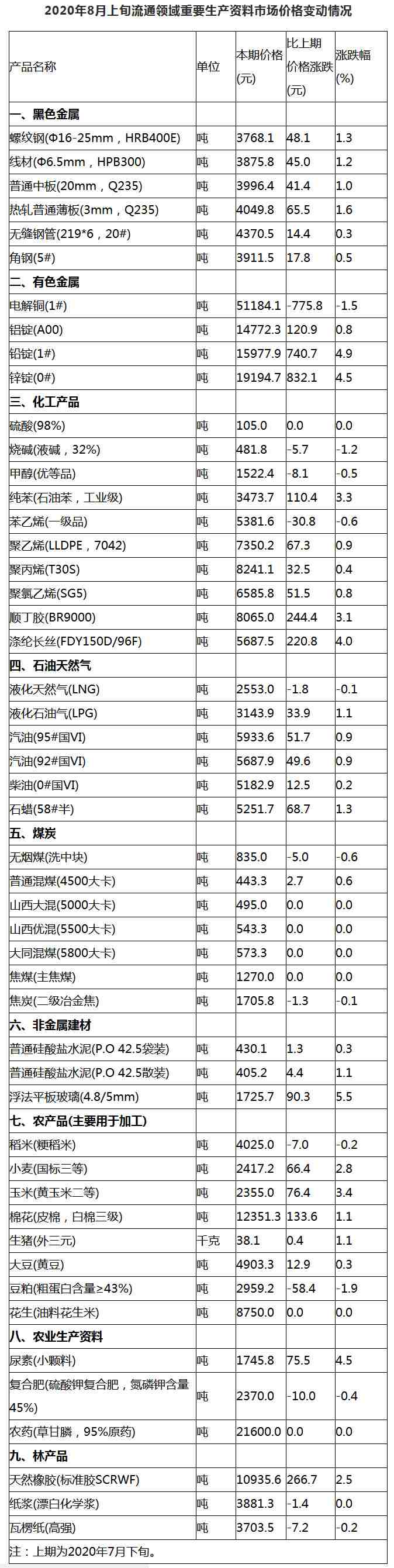 據(jù)國家統(tǒng)計局網(wǎng)站消息,據(jù)對全國流通領域9大類50種重要生產(chǎn)資料市場價格的監(jiān)測顯示,2020年8月上旬與7月下旬相比,31種產(chǎn)品價格上漲,11種下降,8種持平。其中,生豬(外三元)38.1元/千克,與7月下旬相比上漲0.4元,漲幅1.1%。