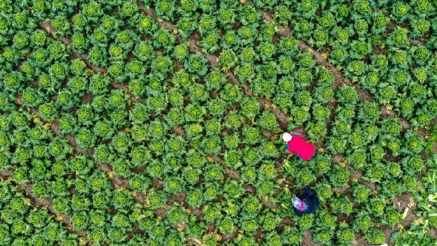2021年11月4日,河北省唐山市豐南區(qū)王蘭莊鎮(zhèn)高先甸村的菜農在蔬菜基地收獲大白菜(無人機照片)。新華社發(fā)(劉滿倉攝)