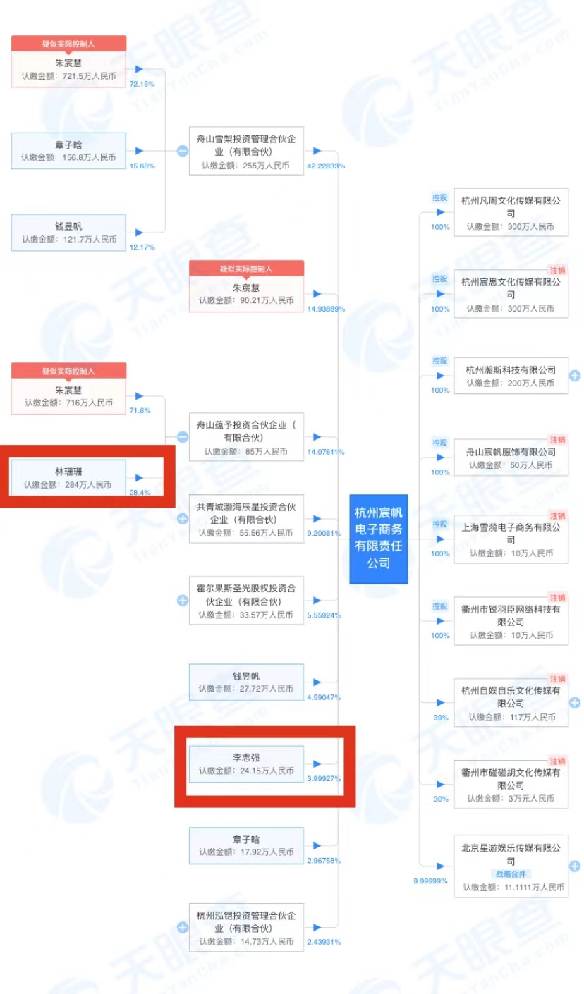 “雪梨”的商業(yè)版圖這些年不斷擴張,天眼查APP顯示,“雪梨”在16家公司任職,其中,在13家公司里擔(dān)任法定代表人職務(wù)。其中,“雪梨”在杭州宸帆電子商務(wù)有限責(zé)任公司持股比例為14.9%,為法定代表人和最終受益人。