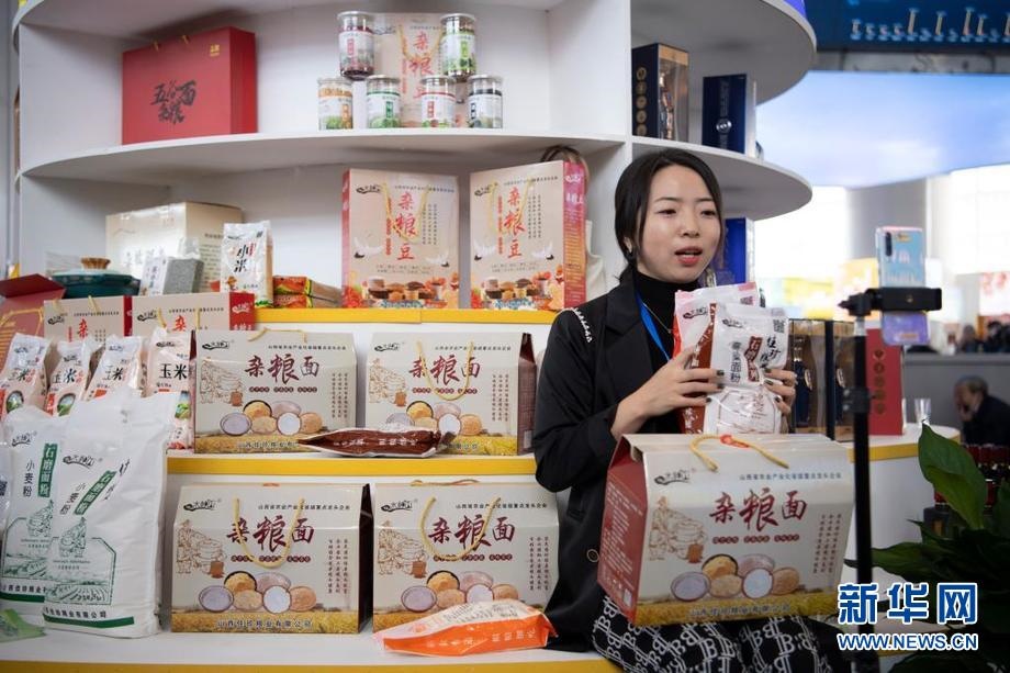 9月22日,一名參展商在位于山西省忻州市忻府區(qū)小檀村的雜糧產(chǎn)品展示展銷展廳內(nèi)進(jìn)行直播銷售。新華社記者 楊晨光 攝