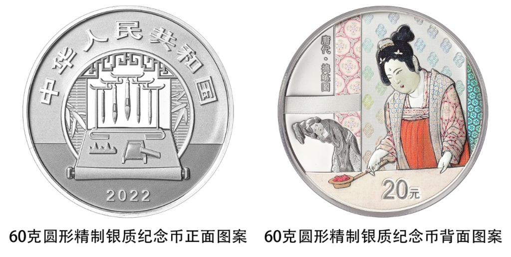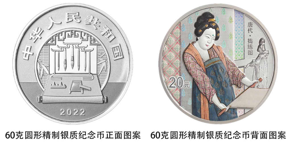 一枚60克圓形銀質(zhì)紀念幣背面圖案為《搗練圖》中扯練造型,襯以裝飾紋樣組合設(shè)計,并刊“唐代·搗練圖”字樣及面額。