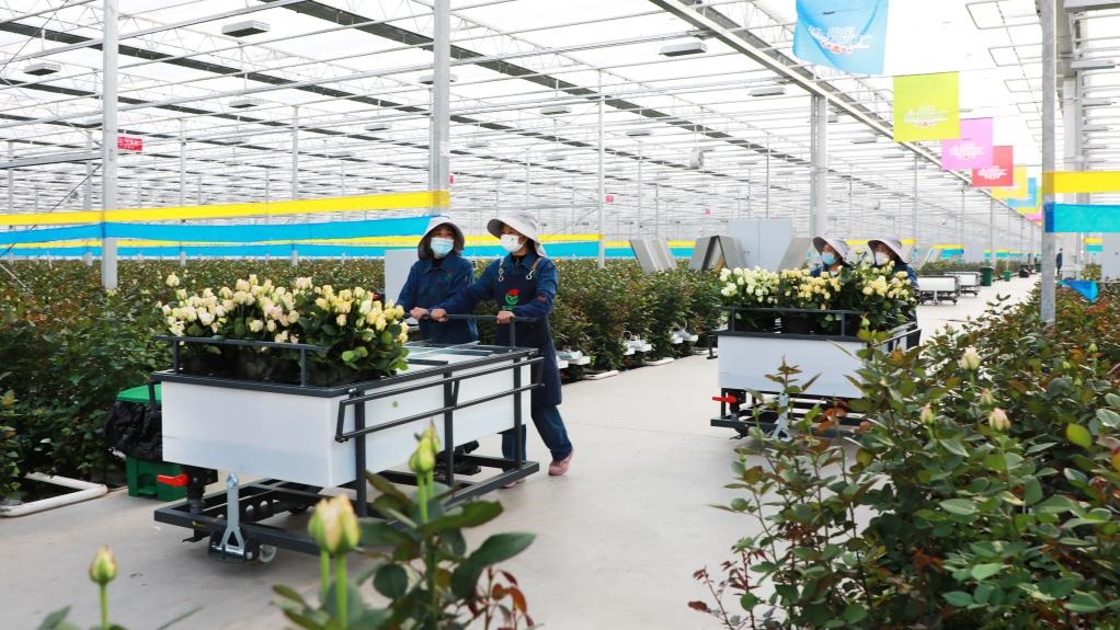 在位于甘肅省臨夏市的百益億農(nóng)國際鮮花港,工人們正在搬運(yùn)剛剛采摘的玫瑰。(受訪單位供圖)