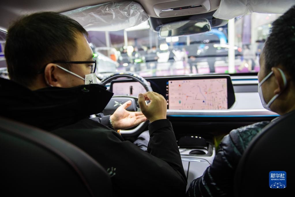 12月24日,在長沙國際會展中心,工作人員(左)向觀眾介紹展車。新華社記者 陳思汗 攝