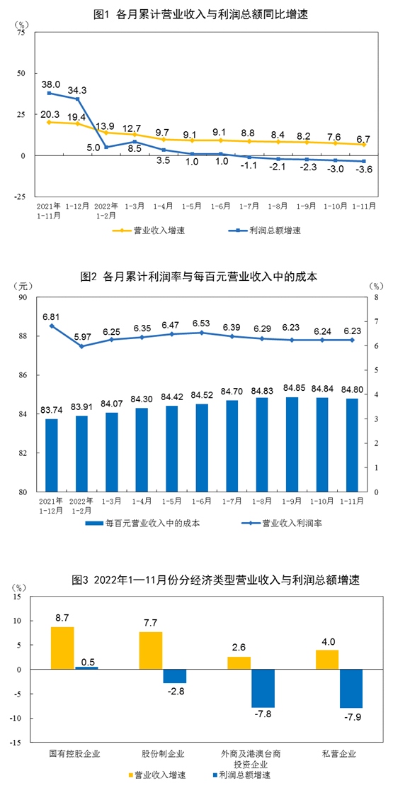國家統(tǒng)計局工業(yè)司高級統(tǒng)計師朱虹表示,11月份,受疫情反彈和需求不足等因素影響,工業(yè)生產有所放緩,企業(yè)經營壓力加大,但利潤結構持續(xù)改善。具體來看,1—11月份工業(yè)企業(yè)效益狀況主要呈現(xiàn)以下特點: