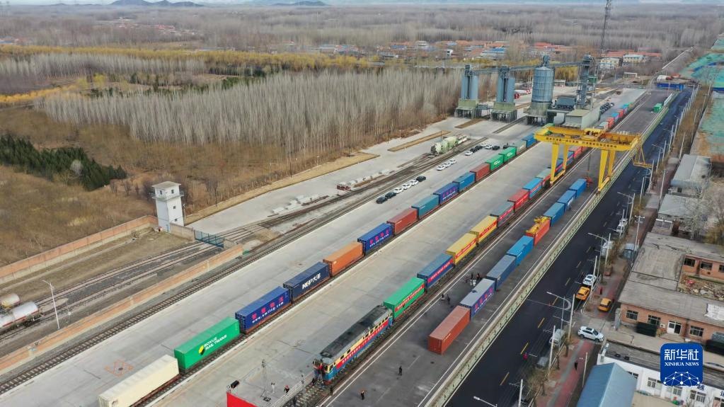 3月16日,在平谷地方鐵路馬坊站,京平綜合物流樞紐中歐班列(北京-莫斯科)??吭谡九_(無人機(jī)照片)。新華社發(fā)