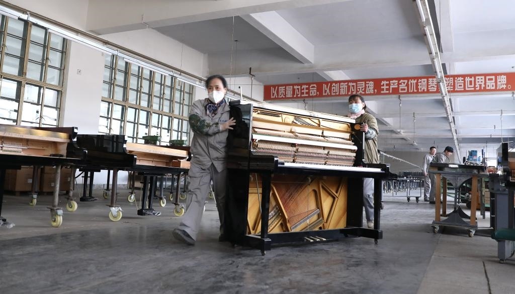 2月21日,工人在東北鋼琴樂器有限公司車間內推運鋼琴組件,趕制外貿(mào)訂單。新華社記者 姚劍鋒 攝