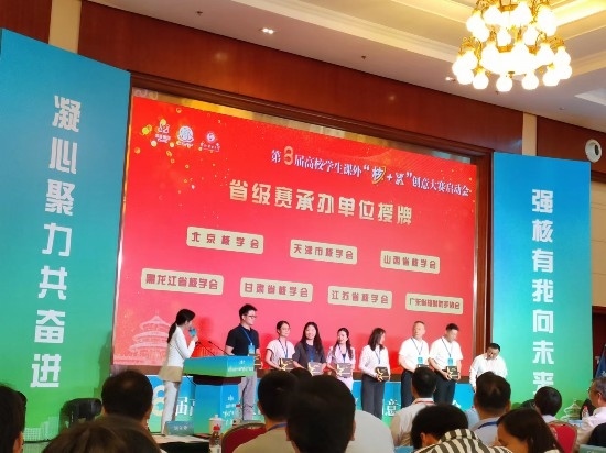 會(huì)上宣布了第八屆“核+X”大賽對(duì)話活動(dòng)承辦高校為吉林大學(xué),并將高校學(xué)生課外“核+X”創(chuàng)意大賽的旗幟從上屆承辦高校西安交通大學(xué)的手中,傳遞給了吉林大學(xué)。