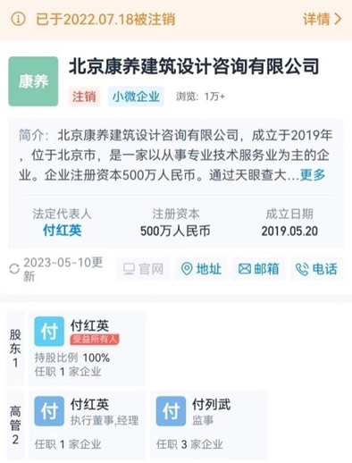 在付列武成為中冶吉信和康和信兩家公司一把手的一周之后,康和信就全資收購了一家個人獨資企業(yè)北京康養(yǎng)建筑設(shè)計咨詢有限公司,被收購的北京康養(yǎng)公司的監(jiān)事是付列武自己,法定代表人是付紅英,付紅英100%持股北京康養(yǎng)建筑設(shè)計咨詢有限公司。