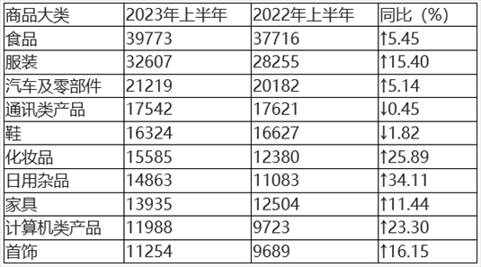 根據(jù)2023年上半年商品大類投訴數(shù)據(jù)(如圖2、表2所示),日用商品類、家用電子電器類、服裝鞋帽類、食品類和交通工具類投訴量居前五位。與2022年上半年相比,日用商品類、醫(yī)藥及醫(yī)療用品類投訴比重上升明顯,房屋及建材類投訴比重有所下降。
