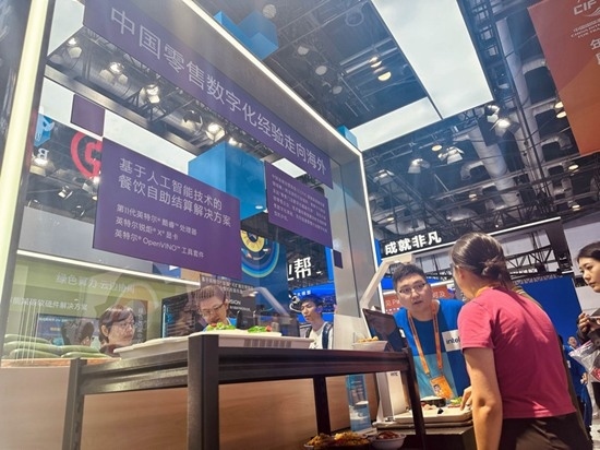 9月2日,觀眾在了解并體驗基于人工智能技術(shù)的餐飲自助結(jié)算解決方案。人民網(wǎng)記者 申佳平攝
