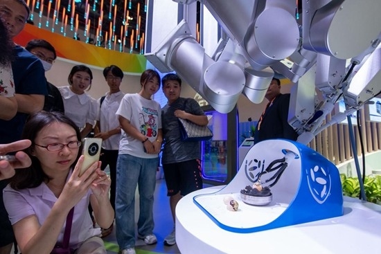 9月2日,在服務貿(mào)易及服務業(yè)擴大開放成就展上,手術(shù)機器人吸引了眾多觀眾駐足。人民網(wǎng)記者 翁奇羽攝