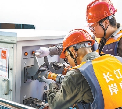 國網(wǎng)宜昌供電公司岸電運維人員為靠泊船舶接通岸電。鄭家裕攝