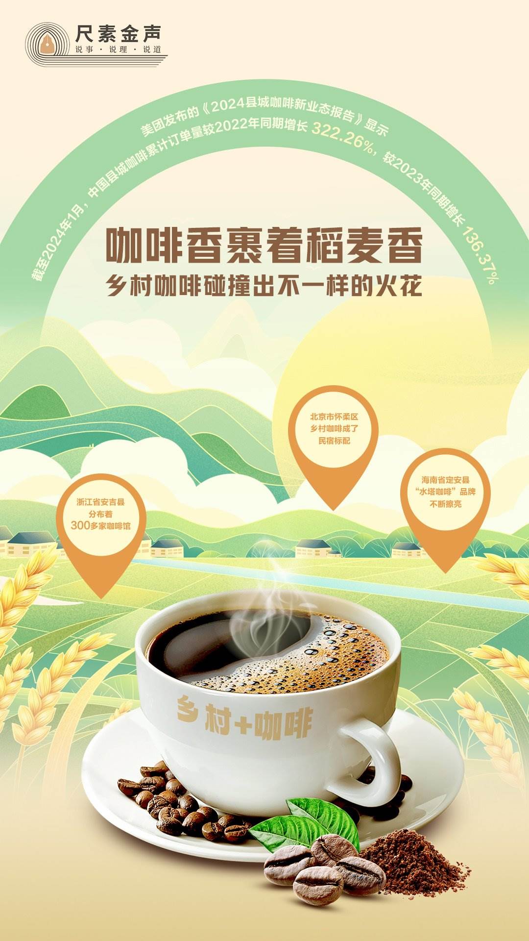 咖啡香裹著稻麥香,吹遍田野?!翱Х?”成為鄉(xiāng)村旅游新業(yè)態(tài)。美團(tuán)發(fā)布的《2024縣城咖啡新業(yè)態(tài)報(bào)告》顯示,截至2024年1月,中國縣城咖啡累計(jì)訂單量較2022年同期增長322.26%,較2023年同期增長136.37%。鄉(xiāng)村咖啡火出圈,背后靠什么?