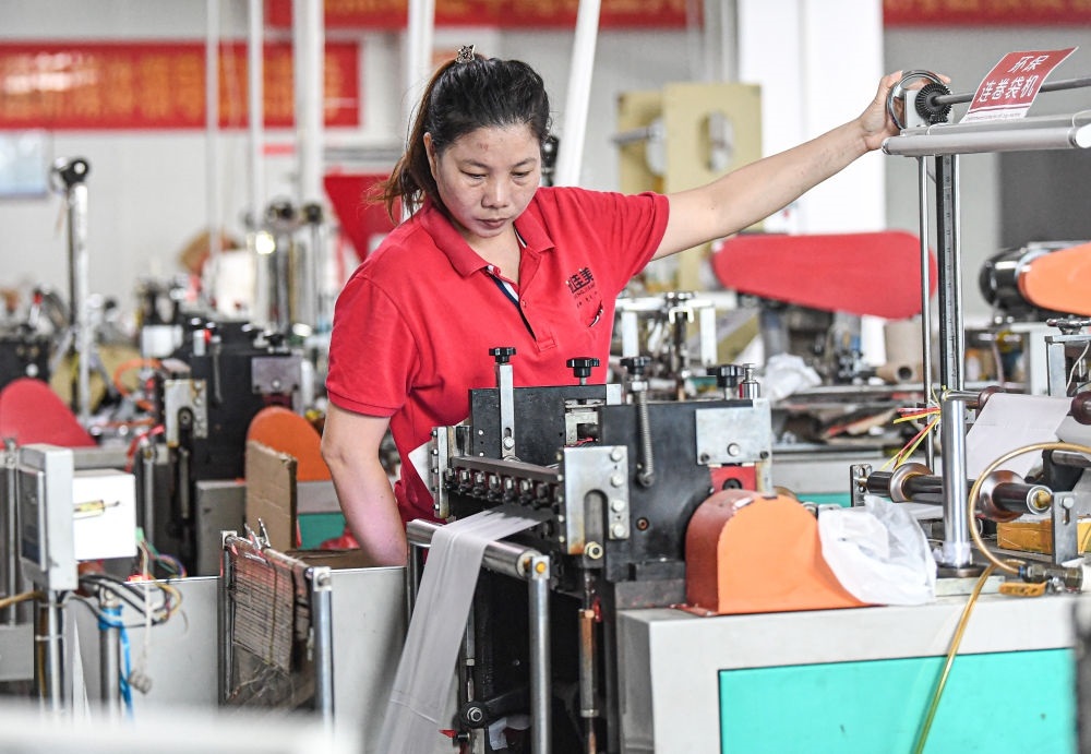 工作人員在海口誠(chéng)佳美塑料包裝有限公司車間生產(chǎn)全生物降解袋(2020年11月4日攝)。新華社記者 蒲曉旭 攝
