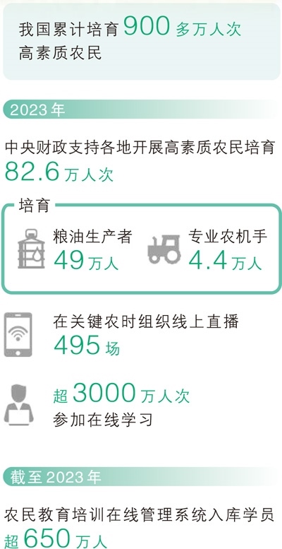目前,我國累計(jì)培育900多萬人次高素質(zhì)農(nóng)民。嘗鮮新技術(shù)、涉足新業(yè)態(tài),一批批高素質(zhì)農(nóng)民積極擁抱專業(yè)化、規(guī)?;?、標(biāo)準(zhǔn)化的現(xiàn)代經(jīng)營理念,為農(nóng)業(yè)農(nóng)村發(fā)展保持穩(wěn)中向好態(tài)勢提供了有力支撐。