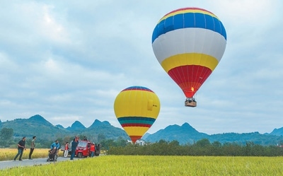 10月6日,湖南寧遠(yuǎn)縣灣井鎮(zhèn)十里畫(huà)廊,游客乘坐熱氣球觀賞田園美景。蔣克青攝(人民視覺(jué))