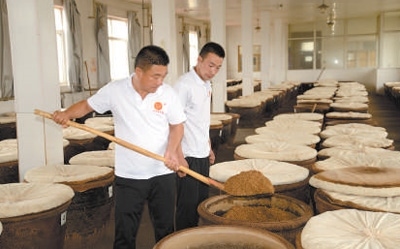 一旁,28歲的學徒李君正把缸里的醋醅翻到另一個醋缸之中。這是為了降溫而進行的“打平翻缸”操作,要持續(xù)15天時間。“宋師傅說,發(fā)酵環(huán)節(jié)最難掌握的就是溫度的控制和時機?!币郧胺N地為生的李君,已經跟著宋俊鵬學了5年釀醋,一個月有將近4000元的收入,“學會獨門技藝,咱也是手藝人了!”