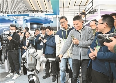 在2024年世界互聯(lián)網(wǎng)大會(huì)“互聯(lián)網(wǎng)之光”博覽會(huì)人形機(jī)器人專區(qū),參觀者與一款人形機(jī)器人握手。新華社記者 蔡湘鑫攝