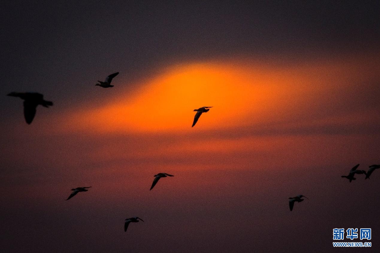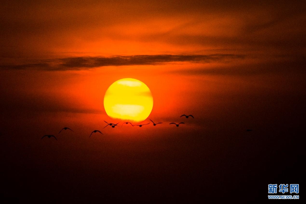 候鳥與夕陽(yáng)。新華網(wǎng)發(fā)(董靜 攝)