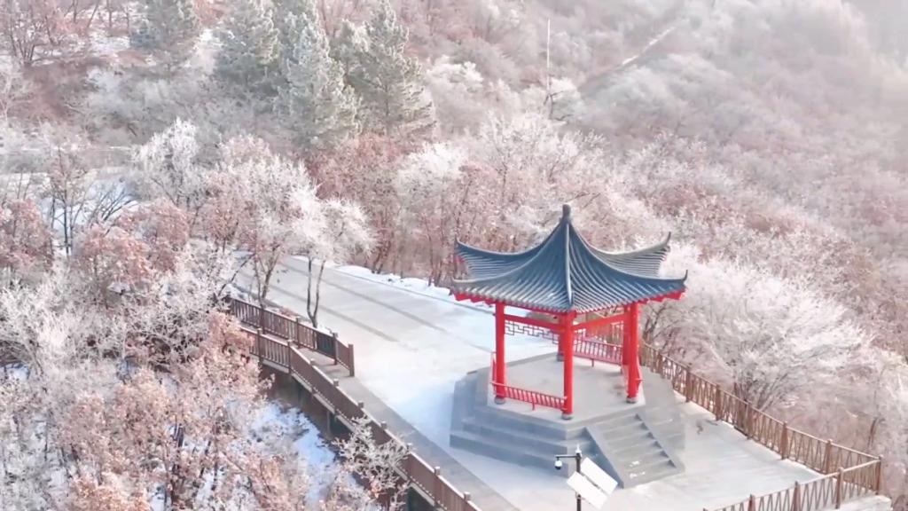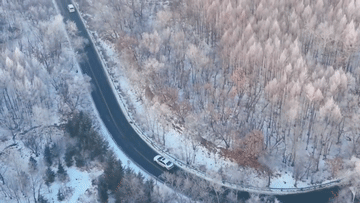 山峰、樹木都被冰雪點綴,粉妝玉砌,銀光閃爍。晶瑩剔透的霧凇與蜿蜒的山路交相輝映,構(gòu)成了一幅壯觀的冬雪美麗畫卷。