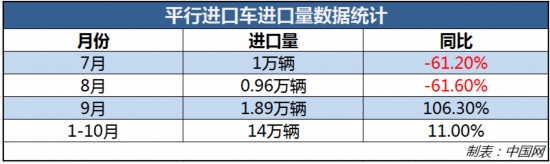 除了新能源汽車進(jìn)口量增長(zhǎng),平行進(jìn)口車也成為了一大亮點(diǎn)。根據(jù)數(shù)據(jù)顯示,今年7、8月份,我國(guó)平行進(jìn)口車在進(jìn)口車市場(chǎng)中成績(jī)還屬較差。其中,7月份平行進(jìn)口車進(jìn)口量約為1萬(wàn)輛,同比下滑了61.2%;8月份平行進(jìn)口車進(jìn)口量也不理想,僅有9600輛,同比下滑了61.6%。但就在9月份,平行進(jìn)口車數(shù)量則出現(xiàn)了大幅攀升。根據(jù)國(guó)機(jī)汽車數(shù)據(jù)統(tǒng)計(jì),9月份我國(guó)平行進(jìn)口汽車進(jìn)口量約為1.89萬(wàn)輛,同比大增106.3%。今年1-10月,平行進(jìn)口車數(shù)量共14.0萬(wàn)輛,同比上漲了11.0%,占進(jìn)口總量的16%。詳情見下表: