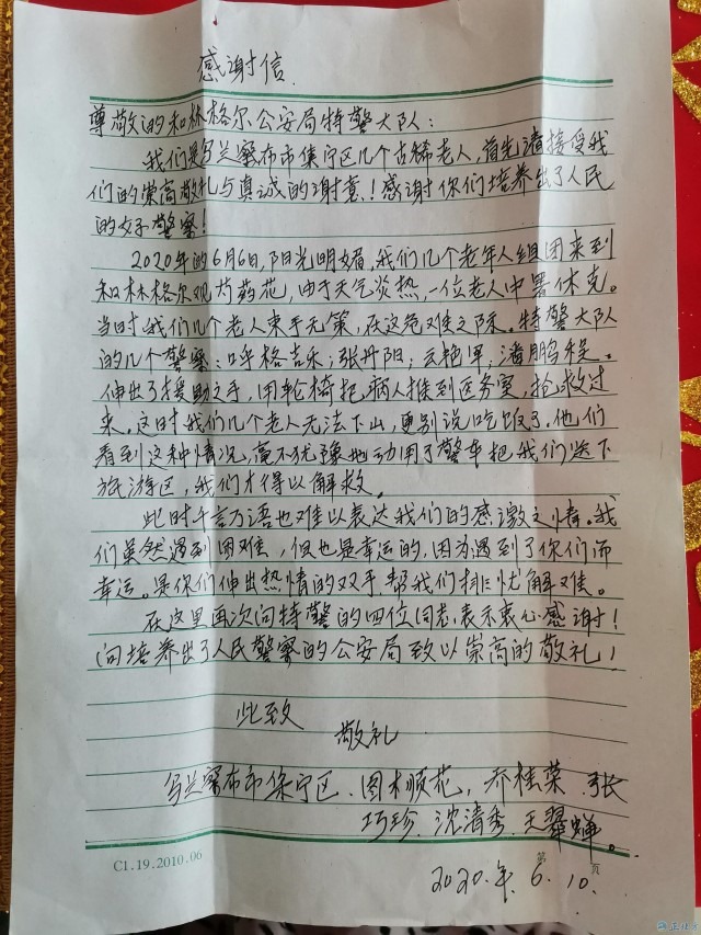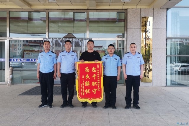 6月17日,呼和浩特市和林格爾縣公安局收到一個(gè)來(lái)自烏蘭察布市的快遞,收件人只寫著和林縣公安局,無(wú)具體部門與姓名。民警將其打開,里面竟是一面寫著“忠于職守、為民解憂”的錦旗、還有一封感謝信及一張合影照片。感謝信中寫道:此時(shí)千言萬(wàn)語(yǔ)也難以表達(dá)我們的感激之情,我們雖然遇到困難,但也是幸運(yùn)的,因?yàn)橛龅搅四銈?,是你們伸出熱情的雙手,幫我們排憂解難……