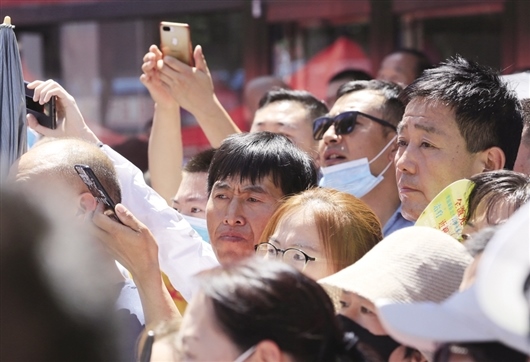 記者現(xiàn)場看到,家長們打著陽傘、戴著口罩,陪著考生等候在校門口,有些學(xué)生的爺爺奶奶也來助陣。“別緊張,正常發(fā)揮就行,我們?cè)谕饷娴饶?。”家長們疏導(dǎo)著孩子的情緒,給考生們加油。