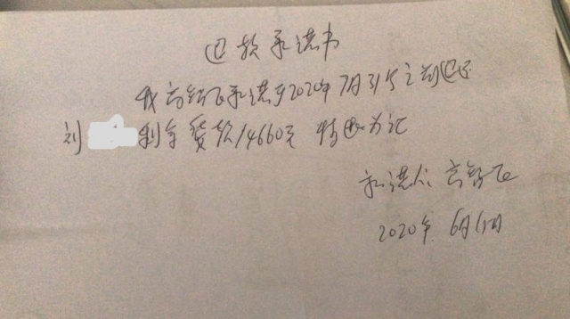 為了不耽誤婚房裝修,劉先生又在居然之家選擇了其他品牌的衛(wèi)浴,并向高經(jīng)理提出退回未付貨的14660元貨款。但高經(jīng)理表示最近手里沒(méi)錢(qián),不過(guò),他答應(yīng)劉先生,在7月31日前會(huì)全部退還,并且當(dāng)場(chǎng)寫(xiě)了一個(gè)退款承諾書(shū)。