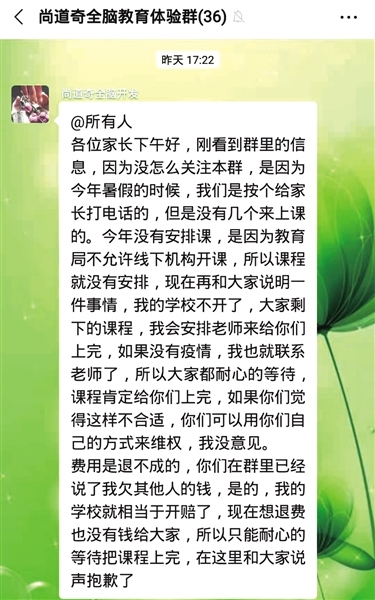 根據謝女士提供的轉賬證明和聊天截圖記者注意到,“尚道奇全腦教育體驗群”1月15日發(fā)布的一則通知稱,今年暑假,機構老師曾挨個給家長打電話通知上課,但是沒有幾個來上課的,加上教育局不允許線下機構開課,所以課程遲遲沒有安排。并稱學校賠錢了,沒有錢退給大家,只能耐心等待疫情結束后安排上課,如果家長覺得不合適,可以用自己的方式維權。“她的說辭明顯前后矛盾,暑假期間說課件損毀,現在又說沒學生上課?!敝x女士氣憤地說,和她遭遇同樣情況的還有30多名家長,399元雖然不是大數目,但這樣欺騙大家實屬不該。
