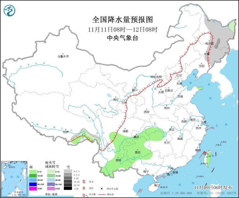 11月9日08時至10日08時,內(nèi)蒙古東北部、東北地區(qū)大部等地部分地區(qū)有小到中雪,其中,黑龍江中西部、吉林中部、遼寧北部等地部分地區(qū)有大到暴雪(10~13毫米)。黑龍江東北部、川西高原北部、四川南部、貴州西南部、云南大部、臺灣島大部等地部分地區(qū)有小雨。內(nèi)蒙古河套地區(qū)和中部、東北地區(qū)西部、黃淮東部、江南東北部等地部分地區(qū)有4~6級風,其中,西藏北部部分地區(qū)有6~7級風。