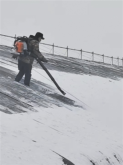 由雪花組成的白色天幕中,“迷彩服”一閃而過(guò)的綠色迸發(fā)出濃濃的生機(jī)。這些人手拿鐵鍬、掃把等工具一邊鏟雪清掃道路,一邊提醒過(guò)路行人:“小心路滑,注意安全?!睖嘏脑?huà)語(yǔ)感染了兩邊的商戶(hù),大家也紛紛加入到了“迷彩”防線(xiàn),投入除雪運(yùn)動(dòng)中。