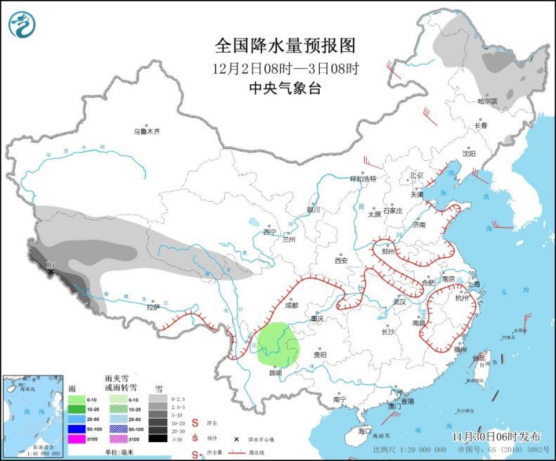 11月30日08時(shí)至12月1日08時(shí),內(nèi)蒙古東部、東北地區(qū)東部等地部分地區(qū)有小到中雪,其中,遼寧東北部、吉林東部、黑龍江東部等地有大到暴雪,其中,黑龍江東南部和東部局地有大暴雪(20~29毫米)。西南地區(qū)南部、臺(tái)灣島大部等地部分地區(qū)有小雨。華北、東北地區(qū)南部、黃淮、江淮、江南東部等地有4~5級(jí)偏北風(fēng),陣風(fēng)6~8級(jí);我國(guó)東部和南部海域?qū)⒂?~9級(jí)風(fēng),陣風(fēng)10~11級(jí)。
