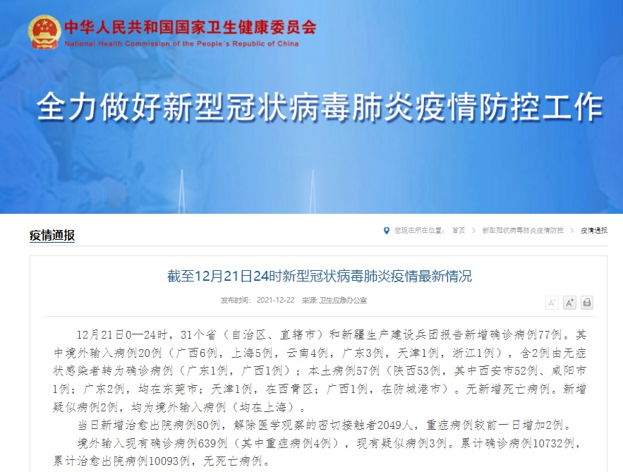 12月21日0—24時,31個省(自治區(qū)、直轄市)和新疆生產(chǎn)建設(shè)兵團(tuán)報告新增確診病例77例。其中境外輸入病例20例(廣西6例,上海5例,云南4例,廣東3例,天津1例,浙江1例),含2例由無癥狀感染者轉(zhuǎn)為確診病例(廣東1例,廣西1例);本土病例57例(陜西53例,其中西安市52例、咸陽市1例;廣東2例,均在東莞市;天津1例,在西青區(qū);廣西1例,在防城港市)。無新增死亡病例。新增疑似病例2例,均為境外輸入病例(均在上海)。
