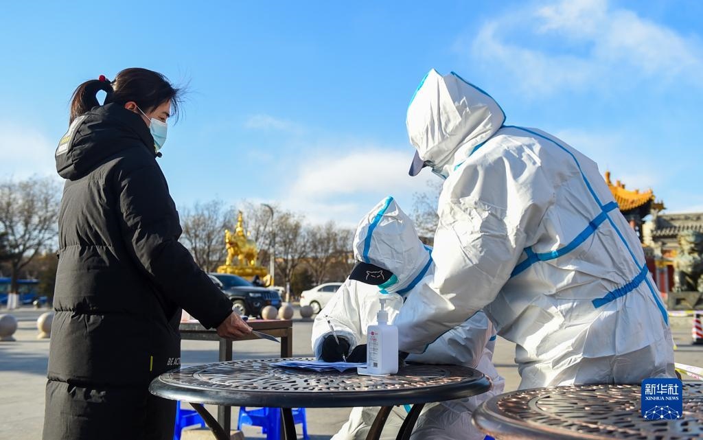 2月19日,在呼和浩特市玉泉區(qū)席力圖召臨時(shí)核酸采樣點(diǎn),工作人員登記信息。新華社記者 彭源 攝