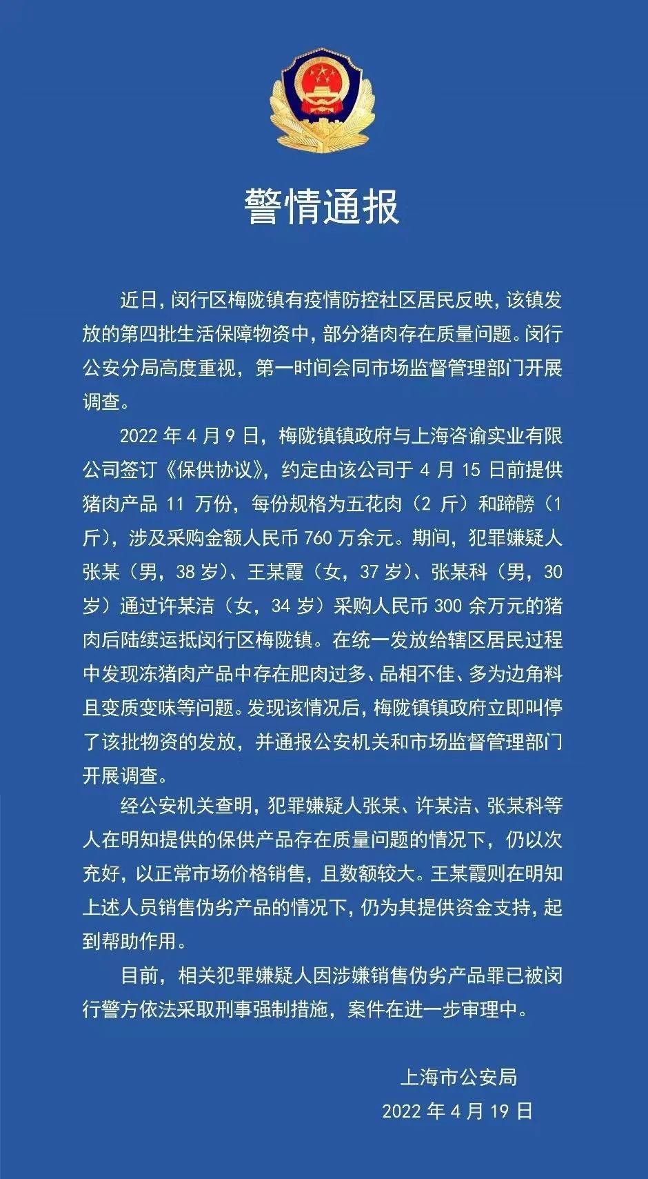 警方通報(bào):2022年4月9日,梅隴鎮(zhèn)鎮(zhèn)政府與上海咨諭實(shí)業(yè)有限公司簽訂《保供協(xié)議》,約定由該公司于4月15日前提供豬肉產(chǎn)品11萬份,每份規(guī)格為五花肉(2斤)和蹄髈(1斤),涉及采購金額人民幣760萬余元。其間,犯罪嫌疑人張某(男,38歲)、王某霞(女,37歲)、張某科(男,30歲)通過許某潔(女,34歲)采購人民幣300余萬元的豬肉后陸續(xù)運(yùn)抵閔行區(qū)梅隴鎮(zhèn)。在統(tǒng)一發(fā)放給轄區(qū)居民過程中發(fā)現(xiàn)凍豬肉產(chǎn)品中存在肥肉過多、品相不佳、多為邊角料且變質(zhì)變味等問題。發(fā)現(xiàn)該情況后,梅隴鎮(zhèn)鎮(zhèn)政府立即叫停了該批物資的發(fā)放,并通報(bào)公安機(jī)關(guān)和市場監(jiān)督管理部門開展調(diào)查。